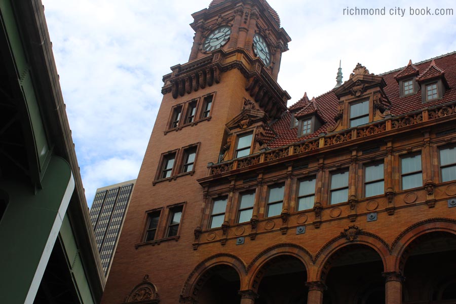The Main Street Train Station (built 1901) popping up from among the more modern buildings in downtown Richmond. The train station services the Amtrak train line running north and south. The central tall building is the Federal James Monroe building.